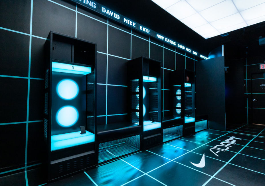 Nike’s Adapt BB sneaker was the first self-lacing basketball shoe. Naturally, their retail merchandising was all about trialing and interactivity, because who doesn’t want to try on a self-lacing future shoe? So, we got to work turning the back room of House of Hoops into a futuristic sneaker testing lab.